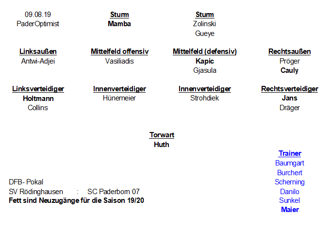 Wie bereits erwähnt, hat Rödinghausen in der Liga schon gestartet. Und das nicht schlecht. 2 schwere Spiele wurden schon gespielt gegen Mönchengladbach II und gegen Fortuna Köln. Beide Spiele wurden gewonnen. Dabei zeigte sich die Elf von Enrico Maaßen sehr offensiv. 7 Tore schoss die Mannschaft, 4 davon machten die beiden Innenverteidiger Flottmann und Wolff nach Standards. Torschützenkönig der letzten Saison Engelmann steht erst bei einem Treffer und will sicher gegen uns nachlegen.