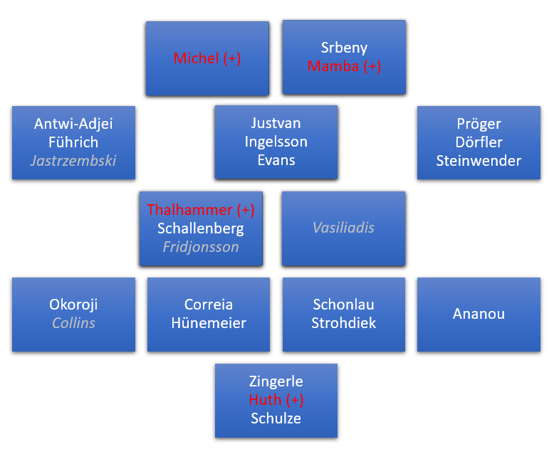 Die aktuellen Langzeitverletzten Michel, Mamba, Thalhammer und Huth schneiden schon eine ganz schöne Schneise durch unseren Kader, daher sind Wechsel am letzten Spieltag durchaus wahrscheinlich. Vor allem, weil Vasi nach wie vor Probleme mit seinem Sprunggelenk hat und jederzeit ausfallen kann. Dazu standen bei ihm, sowie Jamilu Collins Wechselabsichten auf dem Zettel geschrieben. Auch wenn bei ihnen ein Wechsel unwahrscheinlicher wird.